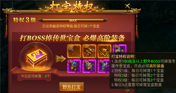 激活特权后,在指定BOSS地图挂机时,有机会获得宝盒,开启后随机得到装备或碎片。