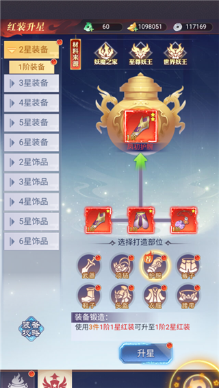 角色一转1重开启,三件相同星阶的装备可以进行升星。