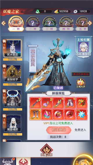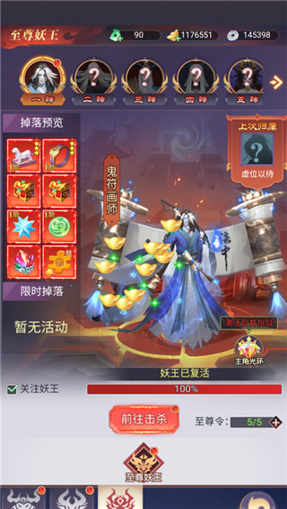 通关第二十五关解锁,拥有五种不同属性的妖王,每一位妖王掉落的装备不同,玩家可以根据自身属性来选择挑战的妖王。(注意:每日只有八次挑战机会。)
