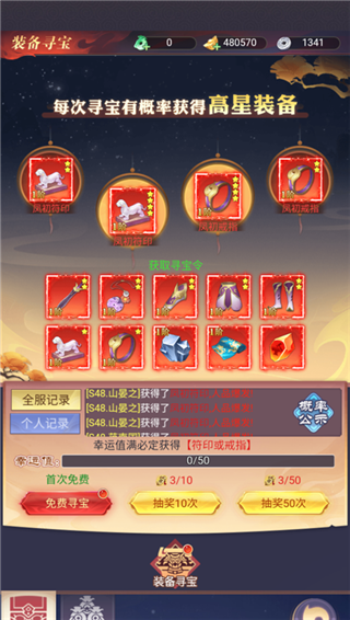 1、装备寻宝通关第十四关解锁,使用元宝可以进行寻宝。