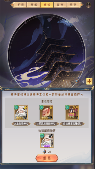在轮回殿-重修可将高星神将退还,返还培养资源,一键换将,培养无损。