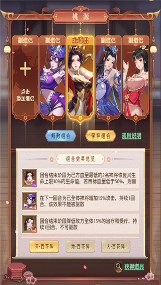 通过西游取经获得赠礼道具,提高道侣等级可在战斗中提供增益状态并提高全体神将属性。