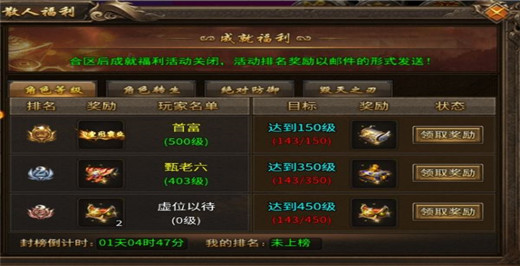 合区后成就福利活动关闭,活动排名奖励以邮件的形式发送!