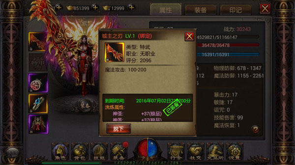 特殊武器为城主专属,每个服仅一人可装备,具有时效性,攻击属性根据职业差异而定,可通过洗炼提升属性。