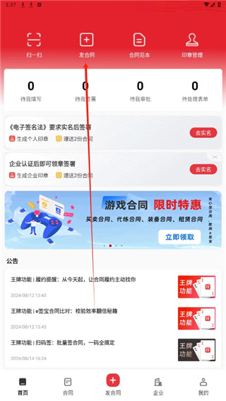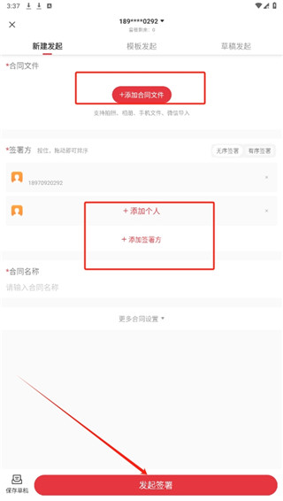 3、最后,进入到该界面中,添加好合同文件,签署方后点击发起签署