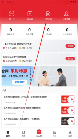 1、打开下载的app,在首页中点击合同范本选项