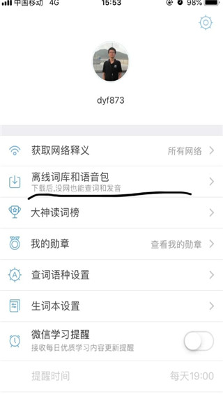 2、在我的选项中,点击下方的离线词库和语言包选项
