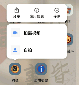 3、返回到手机的桌面中,长按app,点击拍摄视频或自拍选项