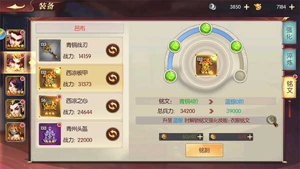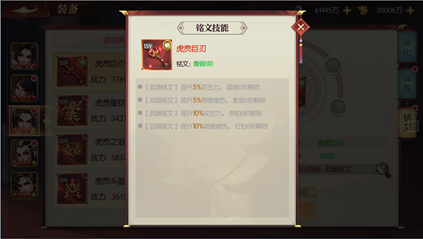 铭文品质分为多个等级,从青铜到红钻,每次铭刻都需要消耗铭刻石,并随着品质的提升,属性增强。升至蓝银品质后,需额外消耗高级铭刻石,以解锁铭文强化技能。