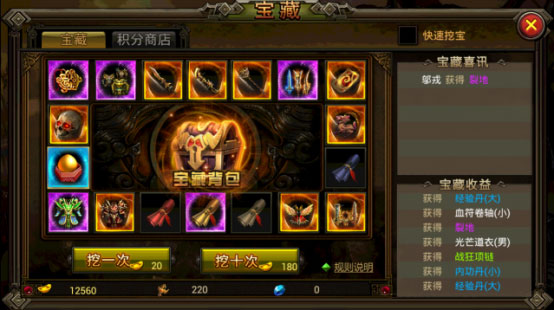 在宝藏玩法中,20元宝可挖一次宝藏,挖十次只需要180。小编建议玩家使用挖十次,因为它不仅更优惠,或得稀有道具的概率也更高
