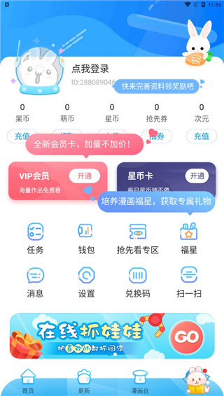 1、进入漫画app首页,可以看到各种分类、活动、福利等功能