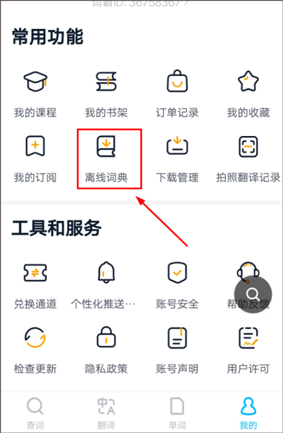 2、在我的界面中,找到常用功能中的离线词典,点击进入