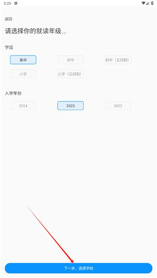 3、随后选择你的粘剂和入学时间,点击下一步选择学校