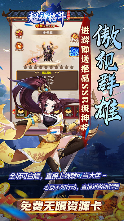 1、开局豪礼,直升50级,万元充值礼包等你拿2、登录即送财宝福袋,绝世仙帝称号,神将马超等豪礼