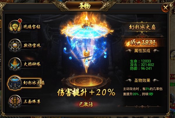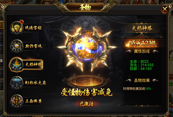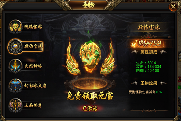 探秘游戏内的圣物系统,共有五大神器:琉璃宝钻、欺诈宝珠、火焰神塔、幻彩冰火扇、三面佛尊,游戏伊始便可激活,无需额外消费。1、琉璃宝钻:每5分钟领取28888元宝,全天多次领取。