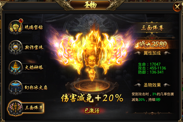 5、三面佛尊:受攻击时3%几率减伤20%,持续5秒。