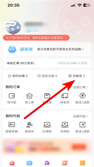 2、在我的界面中,可以看到有三张优惠券,点击进入