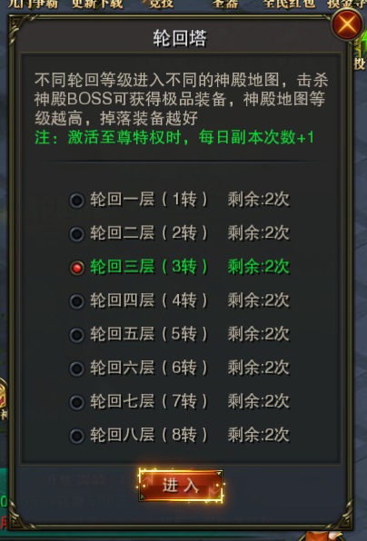 (1)满足特定等级或轮回等级的玩家,可进入相应层级挑战;