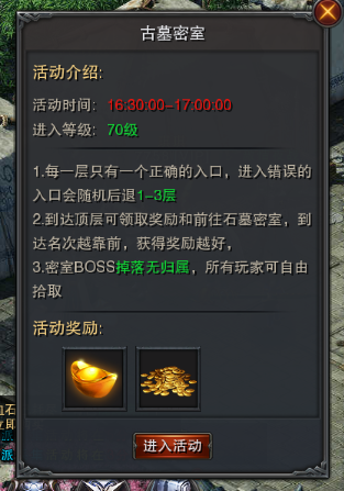 (3)达到第8层后,可由古墓守卫NPC领取奖励,并进入古墓密室;先到者奖励更丰富;