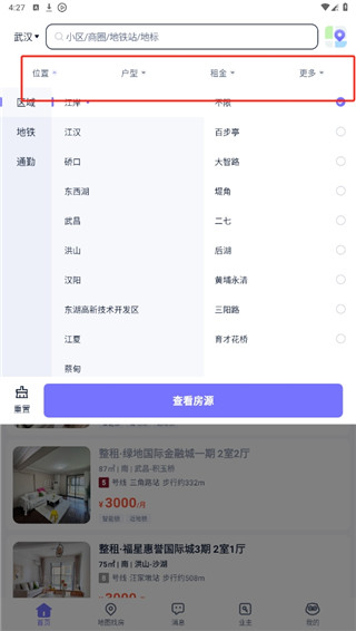 2、通过筛选功能你可以选择适合自己的房源,其中有位置,户型、租金等筛选条件