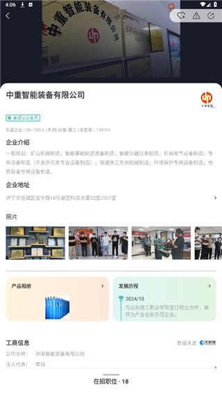 4、进入到企业介绍界面可以看到企业的各种信息和企业的环境视频图片