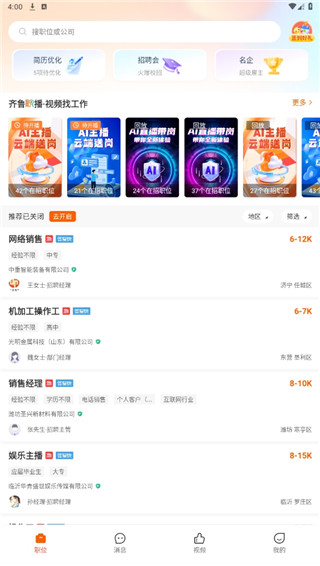 齐鲁人才网app官方版的每一个公司都是经过平台严格审核的,你可以查看到企业的详细介绍,企业的规模等信息,甚至还可以查看到企业的视频照片,帮助自己更好的了解需要入职的企业。此外,软件还提供了简历制作功能,你只需要轻松输入工作经历、个人优势等信息后系统就会自动为你生存一份优质的建立,帮助用户更好的通过面试,让求职更加有把握。如果你正在山东找工作,那么这款软件将帮助你找到满意的工作。