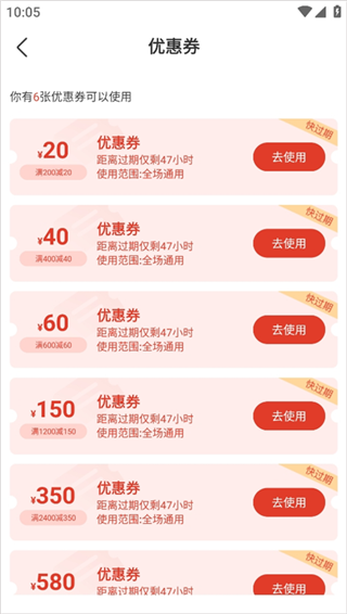 2、在“优惠券”页面中,用户可挑选适合自己的优惠券进行应用。