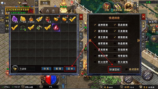 4、获得过多的装备还可以到背包内一键快速回收,获得大量元宝。