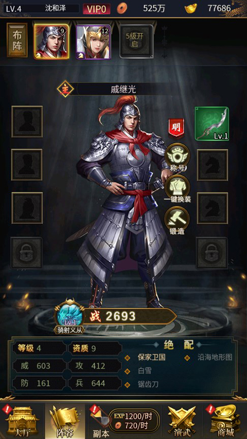 5、通过完成关卡,可以获得各种资源,包括装备、升阶等,玩家可以给武将穿戴和提升,增加战力。