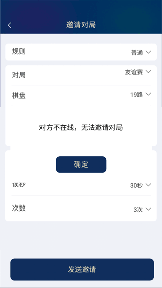 4、设置对弈的规则、模式、棋盘路数、执子规则、棋份、局时、秒读次数,点击邀请即可开始。