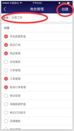 3、输入角色名称,并选择相应权限,最后点击右上角的“创建”按钮以保存设置。