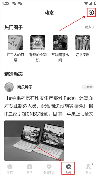 1、进入“动态”,点击右上角的“+”,即可进入动态发布界面。