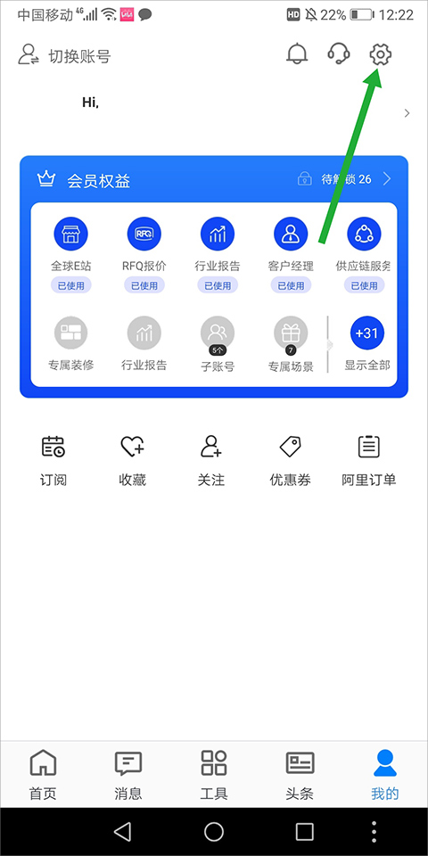 进入【我的】页面中点击右上角的设置图标(下图绿色箭头所指)