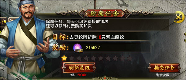 活动介绍:后期主要经验来源之一,通过完成每日的除魔任务来获取稳定的经验,在交付之时还可通过一定的游戏币来获得额外的经验值。
