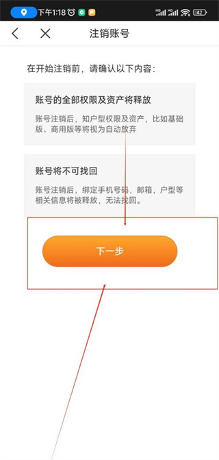 4、点击过后会跳转到注销账号的页面中,阅读详细内容后点击【下一步】;