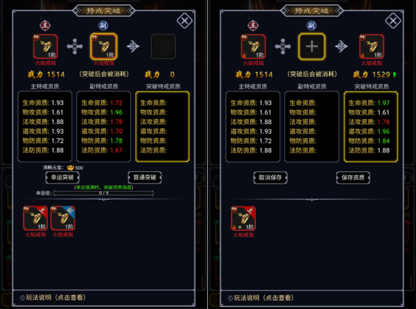 金色特戒比较特殊,需要通过红色特戒进行突破来获得。以一枚红色特戒为主戒,另一枚相同类型特戒为副戒,消耗副戒随机提升或降低主戒的资质。当特戒三条属性资质大于2.0/2.2/2.4/2.6/2.8时,特戒会进阶成金色并根据资质从低到高分为黄、玄、地、天、神五个品质。金色特戒会附加一条切割属性,每次攻击对BOSS造成一定的固定伤害。