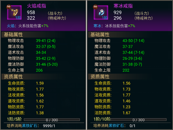 升阶需要消耗黑铁矿石,阶位越高升级所用的黑铁矿石越多,黑铁矿石还是比较珍贵的,建议大家在选择特戒的时候可以优先选择初始神力高的,再选择可升级阶位高的。总之,在过渡阶段,蓝色特戒要能达到最高600神力,紫色特戒要能达到最高2500神力为标准,就可以了。