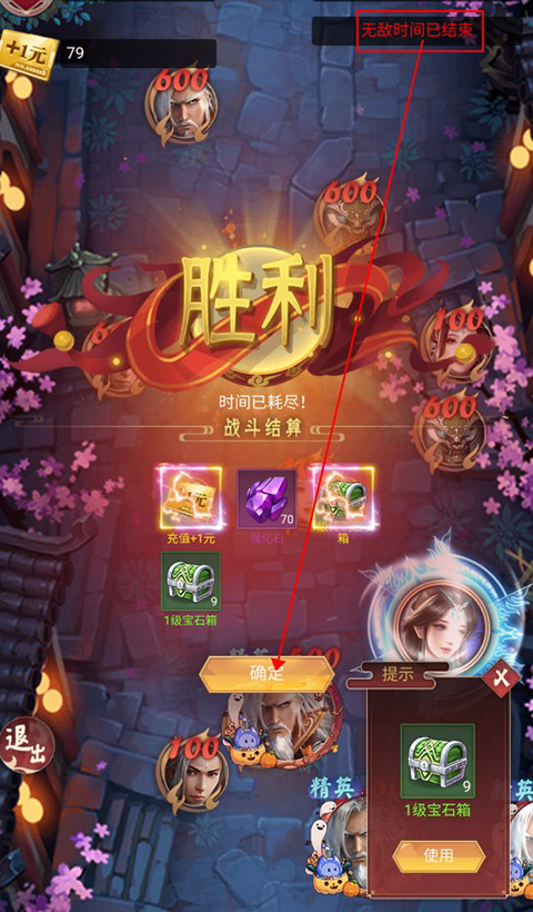 右上角的无敌倒计时结束后,就会结束游戏并获得胜利啦,玩家可以点击右下角快捷使用获得的道具和真充券,也可以直接领取奖励退出关卡。