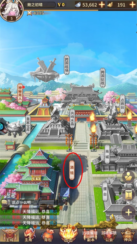 1、首先,玩家需要进入游戏的主城,找到并点击酒馆图标。