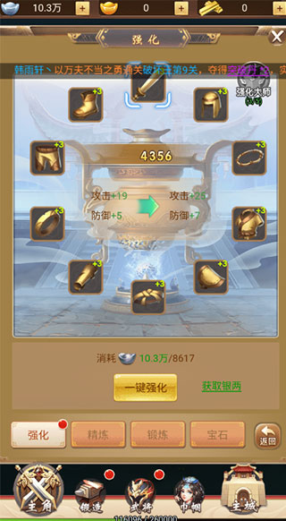 3、定期为主角装备最强装备,并进行升级和精炼,显著提升战斗力。
