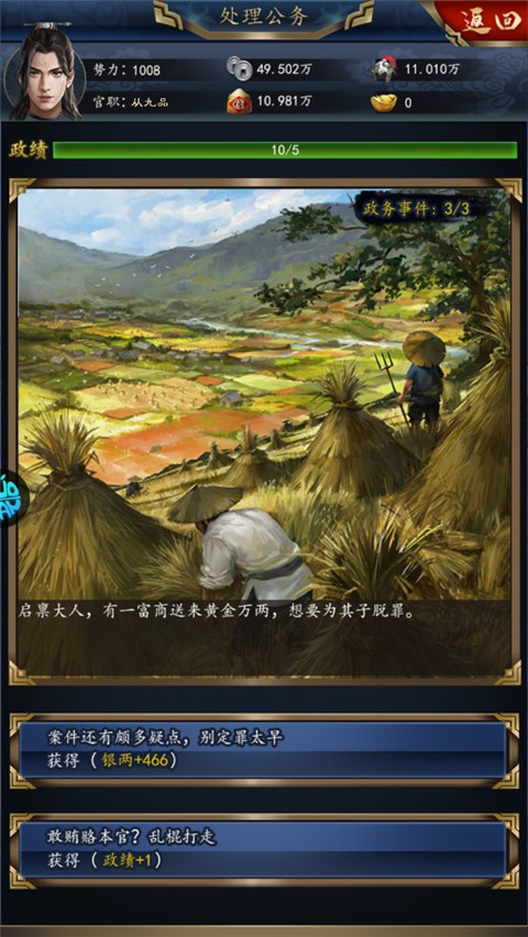 3、处理各种朝政事务,如官员奏报、查处贪腐等,每个决策都需谨慎选择,包括惩处、奖励、重用等策略。