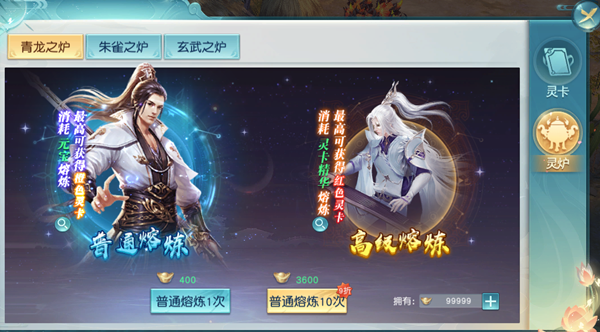 灵卡系统开启于200级,主要通过击败boss获取,提供了紫色灵卡的日常产出。灵炉熔炼分普通熔炼与高级熔炼,分别提供橙色与红色灵卡。