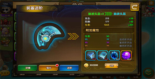 装备进阶可以提升装备的阶级(绿,蓝,紫,橙四阶)。每升一个阶,装备都会打开一个增加一定数额的隐藏属性。但是“进阶”除了需要进阶石之外,还需要其余辅助材料,并且辅助材料基本只能通过副本获得。所以,在几种属性提升方式里,“进阶”是最麻烦的一种。因此小编建议,相要快速提升装备属性,可以适当减少“进阶”的使用。
