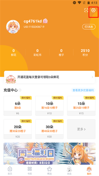 1、打开我的页面,点击右上角的设置图标;