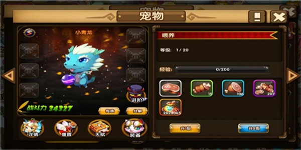 宠物初始等级均为1级,需要通过喂养宠物粮食提升等级,提升等级会增加宠物的属性值。宠物粮食分为【肉片】【小火腿】【大火腿】【一小堆食物】【一大堆食物】,各粮食提供的经验依次增加。如果宠物祝福(宠物升星)等级越高,宠物等级上限也会相应增高,最高上限为100级。