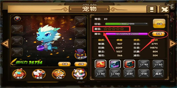 宠物一共有5星,初始为0星,需要通过消耗道具【宠物精华】进行提升。提升宠物星级可以直接增加宠物属性,同时还能提升宠物两个自带的原始技能的等级。注意:原始技能是每个宠物自带的技能,无法通过其他培养更改。