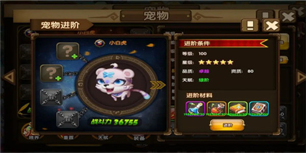 宠物进阶需要消耗【资质丹】【高级资质丹】【各级别技能书】【宠物手册】,而且进阶条件都不一样,不过大体上都需要宠物等级达到100级、星级为5星,品质、资质、天赋则不同宠物之间有所变化。S级宠物进阶需要消耗额外的S级宠物,SSS级宠物进阶则需要额外的SSS级宠物和3个S宠物。进阶后会获得额外的宠物技能。