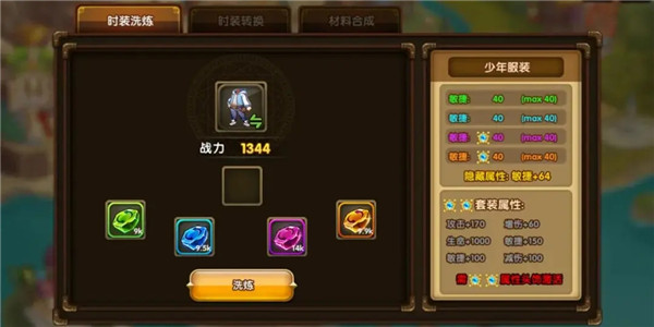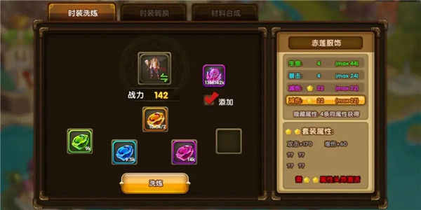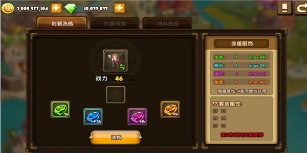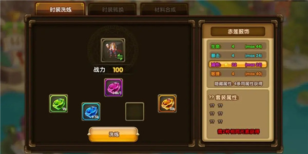 首先给大家介绍一下【时装洗炼】界面内容,界面的左边区域是时装选择和材料选择区,右边区域是时装洗炼结果的展示区。其中,右边区域的上方有4条属性和max属性展示,消耗不同颜色的洗炼石时,会随机改变对应颜色属性的类别和数值。