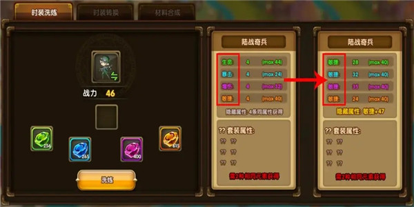 洗炼过程中,属性类别和数值会同时随机改变,最高属性数值就是max。当4条属性都洗炼出相同属性类别时,则激活隐藏属性。注意一下,如果当4条相同属性类型都洗炼出max后,隐藏属性值也为max!
