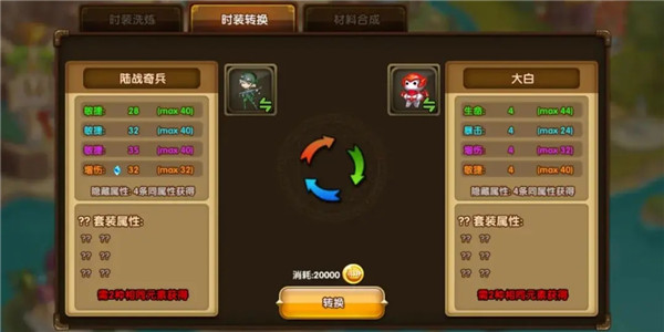 【时装转换】只能使用相同部位的时装,进行互相转换。转换后,时装上的所有属性将会直接互换,并且只耗费少量金币。